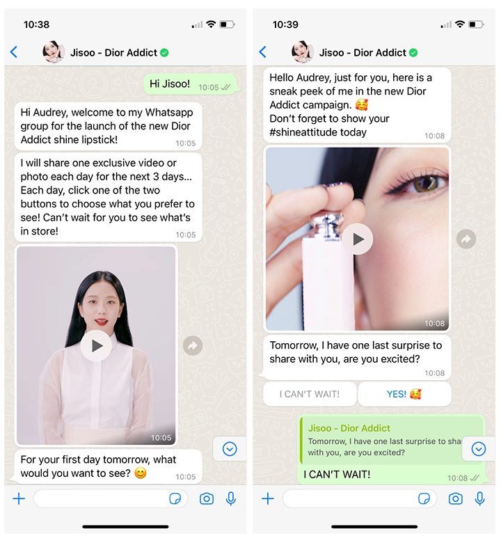 Gli utenti possono prendere parte alla campagna attraverso le Instagram story di @diorbeauty, dove Jisoo invita i propri follower a unirsi al suo “esclusivo gruppo WhatsApp”, che indirizza i clienti a una landing page dedicata, dove possono iscriversi per interagire tramite chatbot WhatsApp con Jisoo prima del lancio del nuovo rossetto Dior Addict shine. I membri possono scegliere il tipo di contenuto che vogliono ricevere, dai video a tema ai filmati esclusivi del backstage dell’esperienza di Jisoo come ambassador Dior.