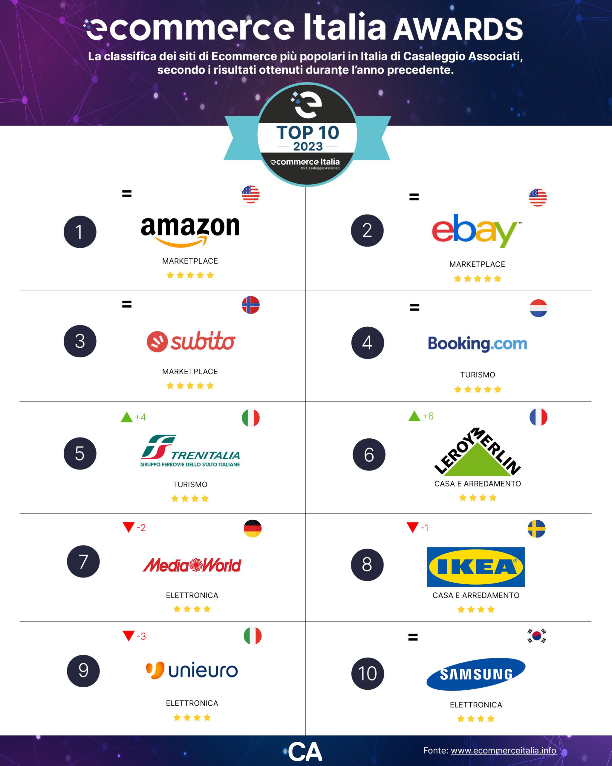 Italia Awards 2023, mettono ai primi posti 3 differenti marketplace: 1 Amazon, 2 eBay e 3 Subito. A seguire Booking e Trenitalia del settore Turismo, che finalmente vede una ripresa economica dopo la pandemia Covid-19.  Dal sesto al decimo posto aziende di Elettronica e Casa e Arredamento, quali Leroy Merlin, Mediaworld, Ikea, UniEuro e Samsung.