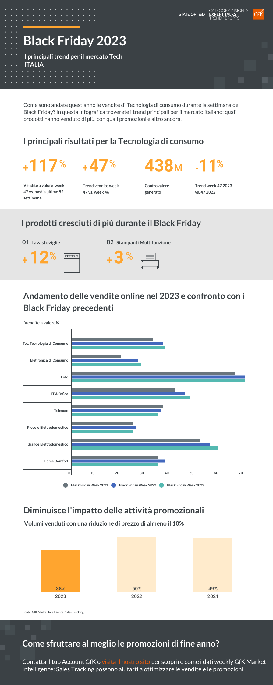 L’impatto delle attività promozionali nella settimana del Black Friday è calato rispetto agli ultimi anni, e si assesta al 38% dei volumi venduti con una riduzione di prezzo di almeno il 10. I Mediatablets sono stati il prodotto con la percentuale più alta di vendite promozionali (54%).