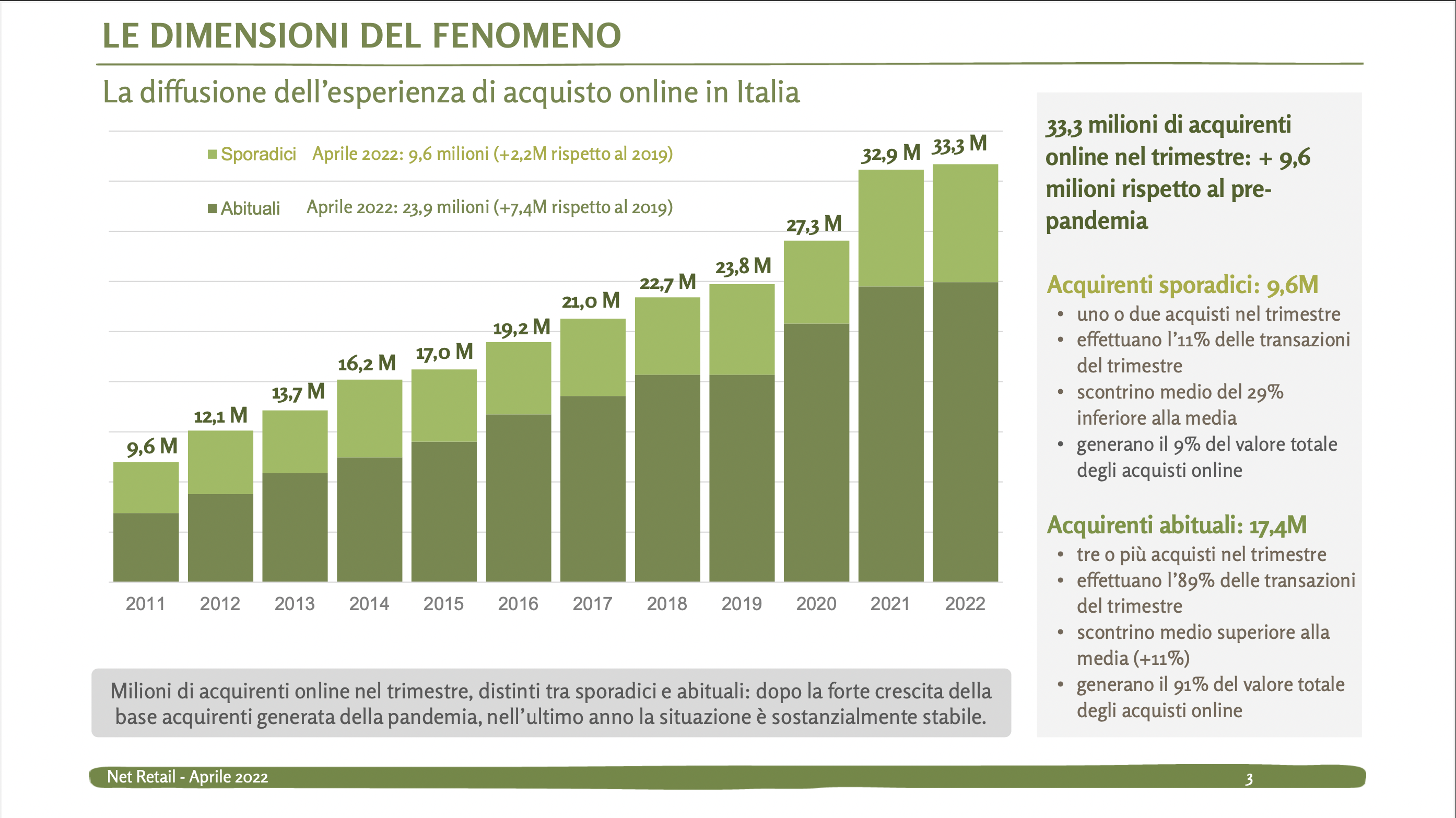 Secondo la ricerca di Netcomm, “NetRetail”, sono 33,3 milioni gli italiani che hanno acquistato online nell’ultimo trimestre, +9,6 milioni rispetto al periodo pre-pandemia.