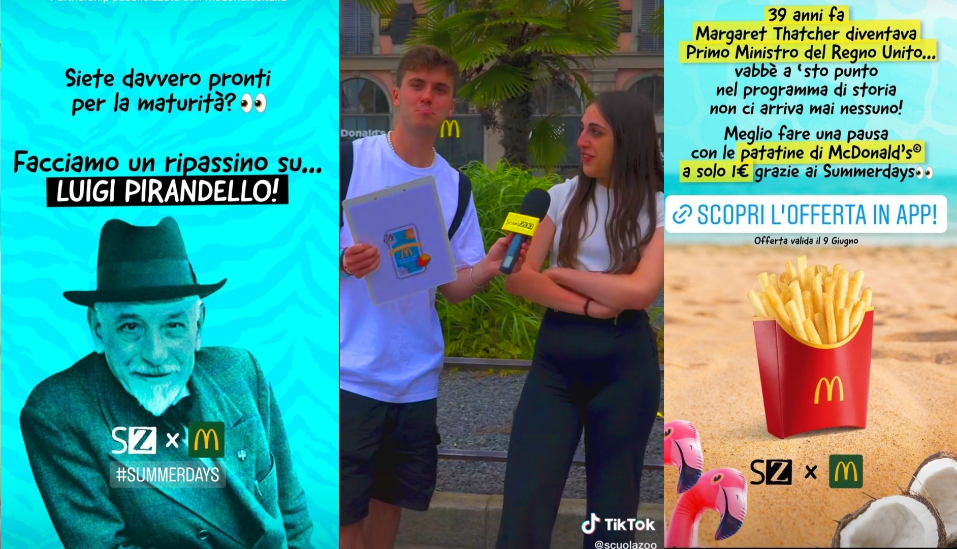 Tra quiz di ripasso e short video pubblicati sui canali Instagram e TikTok di ScuolaZoo, gli oltre 4,2 milioni di follower della community studentesca più grande d’Italia hanno potuto imparare divertendosi, dal momento che l’ilarità è parte del DNA di ScuolaZoo e dei suoi format, e al tempo stesso sono stati informati sugli sconti attivi sui prodotti più amati di McDonald’s Italia. Dei branded content studiati ad hoc che, giorno dopo giorno, hanno accompagnato gli studenti nelle loro pause-studio.