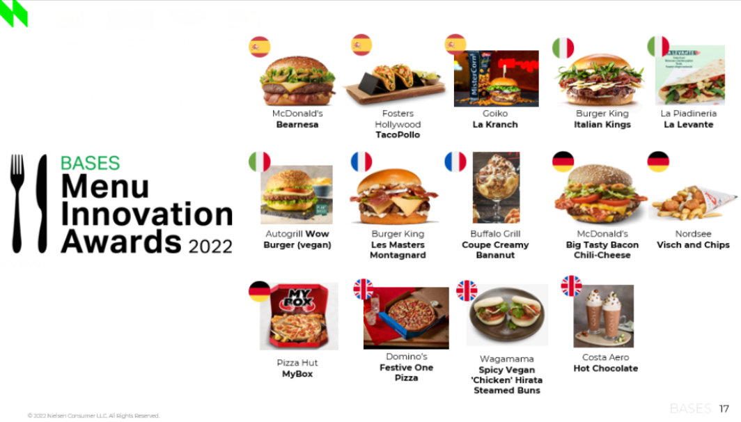 Il team di NielsenIQ BASES Restaurant ha giudicato ogni nuova preparazione in termini di rilevanza – prodotti che i consumatori hanno dichiarato di volere o desiderare – e di innovazione – piatti che le persone hanno trovato innovativi ed interessanti. I 14 piatti vincitori, secondo il parere degli intervistati, provengono da Italia, Spagna, Francia, Germania e Regno Unito.