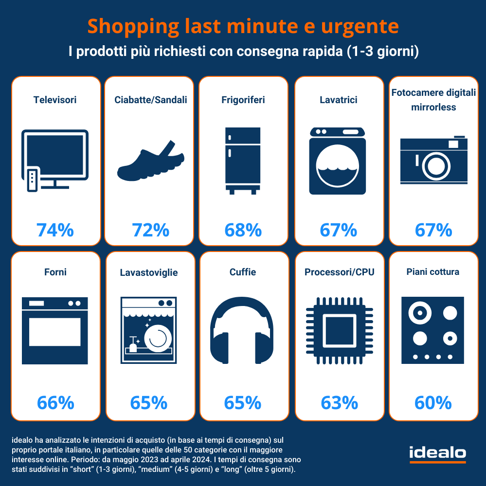 Analizzando il comportamento degli utenti negli ultimi dodici mesi, idealo segnala che l’urgenza è un fattore determinante in grado di condizionare l’interesse all’acquisto di determinati articoli: nel dettaglio, prendendo in considerazione i click registrati sulle offerte “short” – che prevedono la consegna entro massimo 3 giorni – spiccano sul podio degli articoli più ricercati televisori, sandali e frigoriferi con rispettivamente il 74%, 72% e 68% delle intenzioni di acquisto.