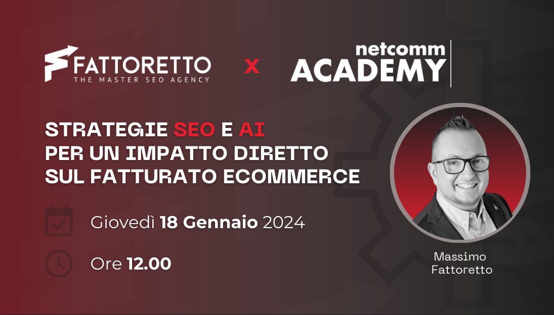 Milano, 11 gennaio 2024 – Fattoretto Agency, realtà di rilievo nel panorama italiano della SEO, è orgogliosa di presentare un nuovo evento esclusivo, realizzato in collaborazione con Netcomm ACADEMY: il webinar “Strategie SEO e AI per un impatto diretto sul fatturato eCommerce“. Previsto per giovedì 18 Gennaio 2024, alle ore 12:00, l’appuntamento si rivolge a professionisti del settore, desiderosi di esplorare le frontiere più avanzate del marketing digitale.